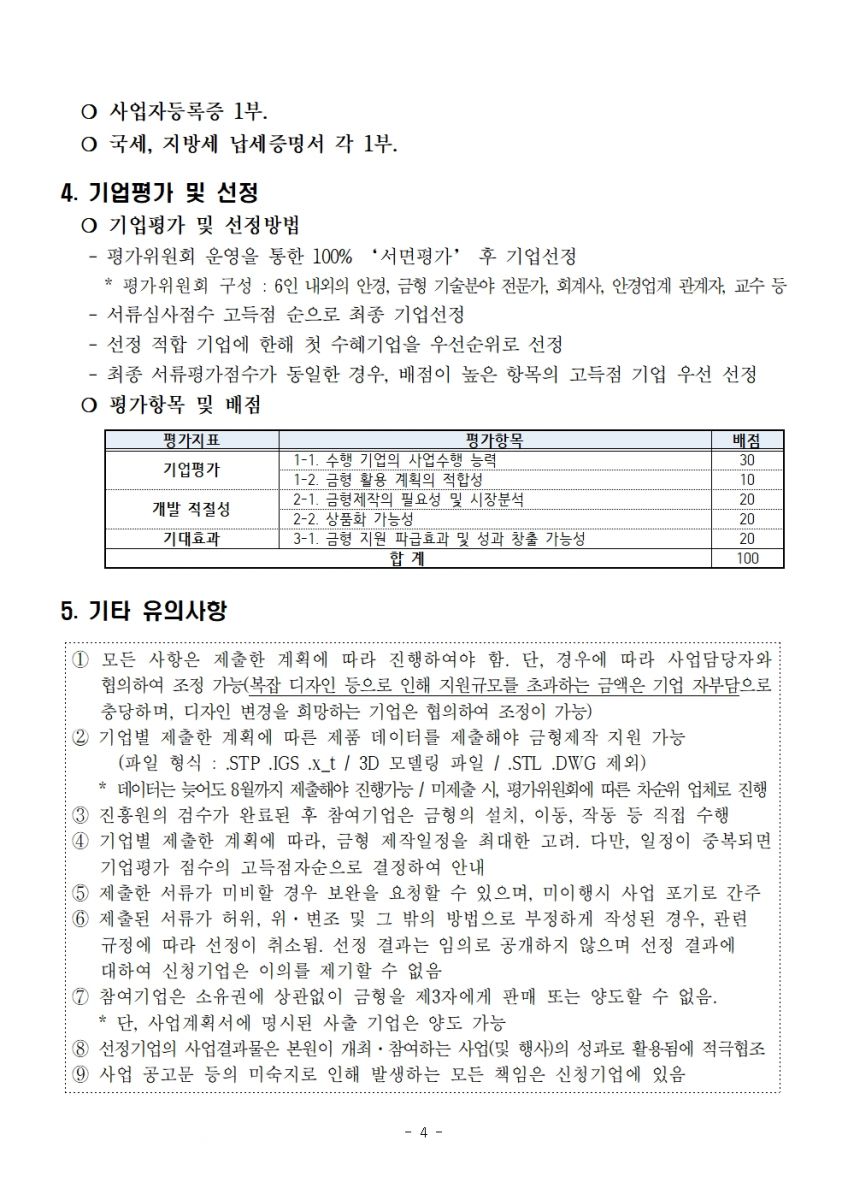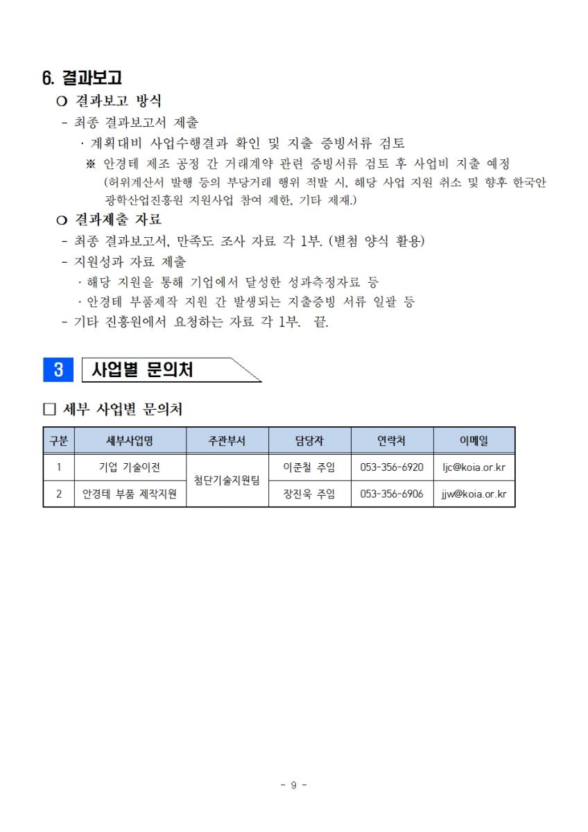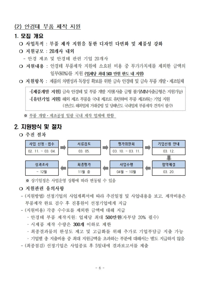 [ 진행중 ] 2026년 3D융합안경테 제조기반 구축 사업 통합공고 첨단기술지원팀 작성일2026.02.11 공고기간2026-02-11 ~ 2026-03-04 URL 링크 조회수386 2026년 3D융합안경테 제조기반 구축사업 공고.pdf (양식)2026년 3D융합안경테 제조기반 구축 사업 참여신청서.hwp 목록으로 이전글 2026년 한국안경산업고도화육성사업 통합공고 다음글 [모집공고] 제24회 대구국제안경전(DIOPS 2026) 북구안경특구기업지원관 참가업체 모집안내