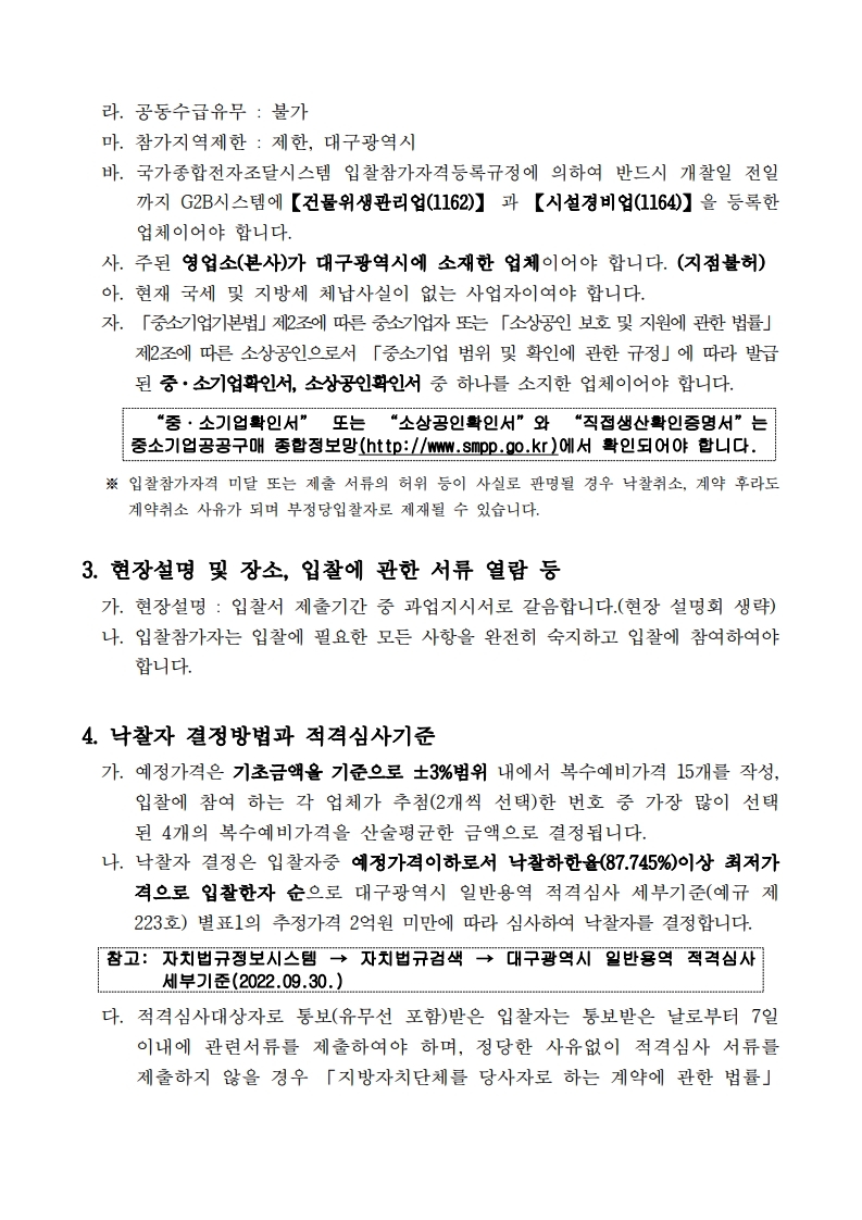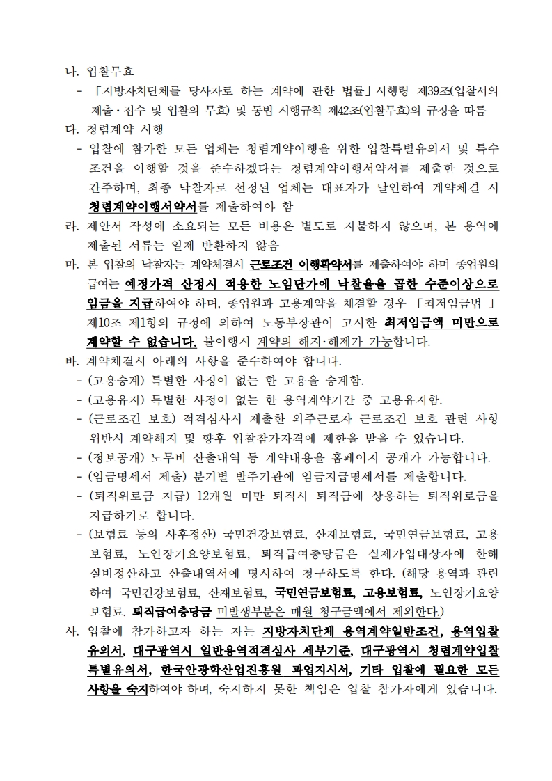 [ 종료 ] 2026년 한국안광학산업진흥원 주차·경비·청소 통합관리 용역 입찰공고 관리자 작성일2025.11.04 공고기간2025-11-04 ~ 2025-11-11 URL 링크 조회수231 붙임1. [공고문]2026년 한국안광학산업진흥원 주차·경비·청소 통합관리 용역.pdf 붙임2. [과업지시서]2026년 한국안광학산업진흥원 주차·경비·청소 통합관리 용역.pdf 붙임3. 대구광역시 일반용역 적격심사세부기준(대구광역시예규제223호_2022.9.30).pdf 붙임4. 청렴계약 이행서약서.pdf 붙임5. 원가계산서.pdf 목록으로 이전글 2025년 6차 안경테표면처리센터(지식산업센터) 입주기업 모집공고 다음글 2026년도 아이빌 전기시설관리용역 입찰공고