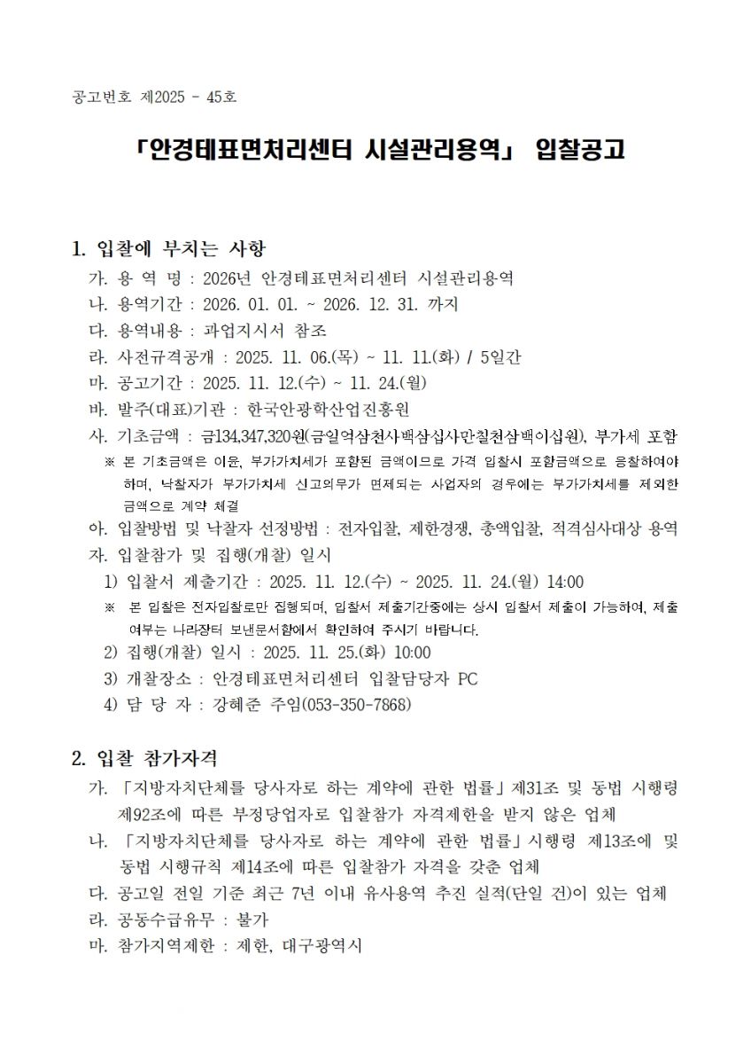 [ 종료 ] 2026년 안경테표면처리센터 시설관리용역 입찰공고 안경테표면처리센터 작성일2025.11.12 공고기간2025-11-12 ~ 2025-11-24 URL 링크 조회수119 붙임 1. 안경테표면처리센터 시설관리용역 입찰공고문.pdf 붙임 2. 2026년 안경테표면처리센터 시설관리용역 과업지시서.pdf 붙임 3. 대구광역시 일반용역 적격심사 세부기준 (예규 제223호).pdf 목록으로 이전글 2026년도 아이빌 전기시설관리용역 입찰공고 다음글 「불용물품(장비) 일괄 매각」 입찰공고