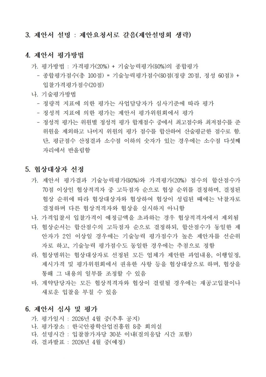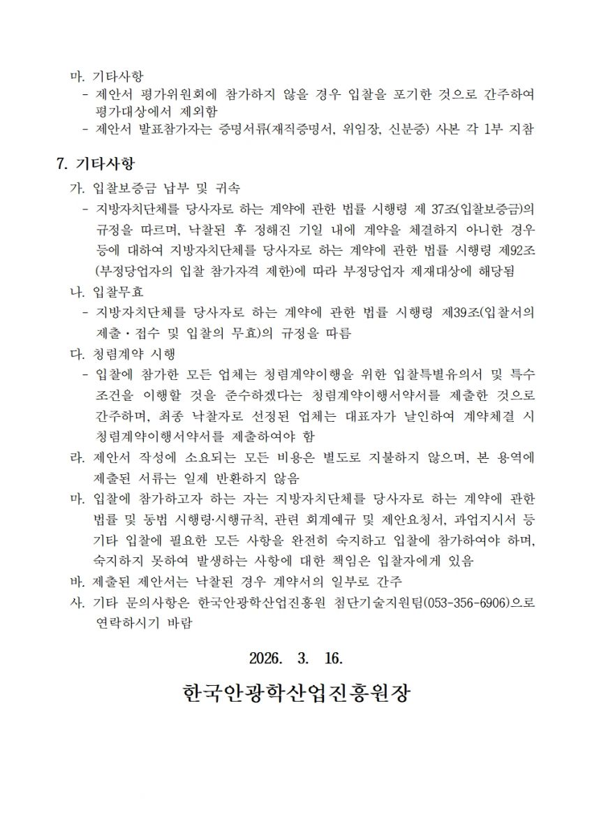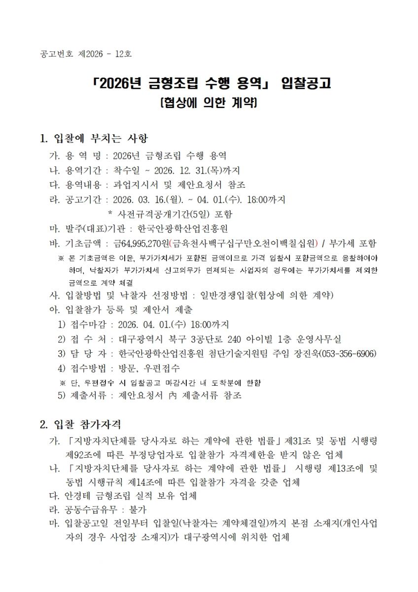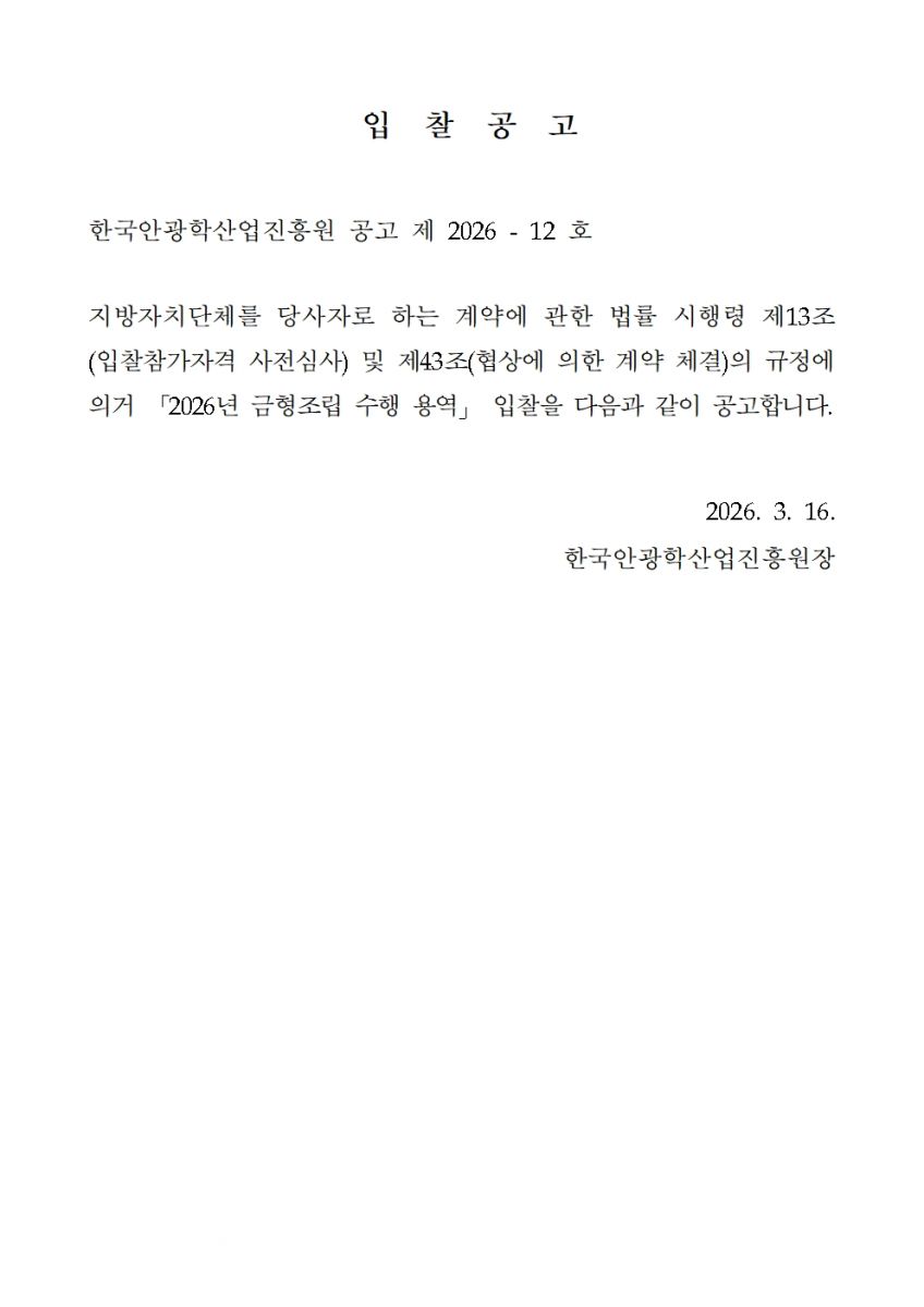[ 진행중 ] 2026년 금형조립수행 용역 입찰공고 관리자 작성일2026.03.16 공고기간2026-03-16 ~ 2026-04-01 URL 링크 조회수44 (입찰공고문) 금형조립 수행용역 입찰공고문(안).pdf (과업지시서) 금형조립 수행용역 과업지시서(안).pdf (제안요청서) 금형조립 수행용역 제안요청서(안).hwp 목록으로 이전글 2026년도 안경테표면처리센터 시설 전대 2차 공고 시행 다음글 다음글이 없습니다.