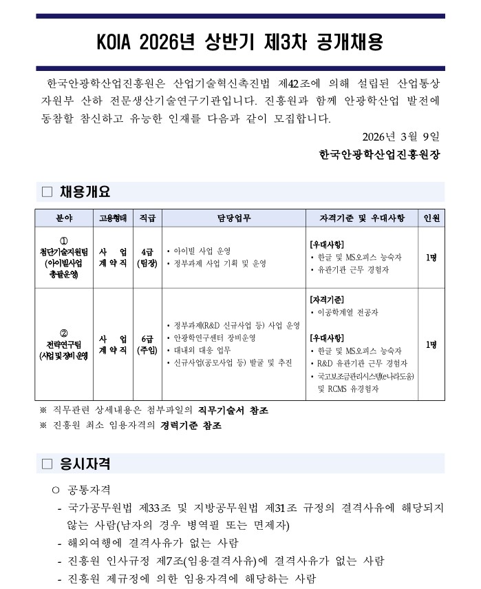 [ 종료 ] 2026년 상반기 제3차 공개채용 공고 관리자 작성일2026.03.09 공고기간2026-03-09 ~ 2026-03-23 URL 링크 조회수418 공고_2026년 상반기 제3차.pdf 직무기술서_2026년 상반기 제3차.pdf 입사지원서_2026년 상반기 제3차.hwp 36309_채용이의신청서.hwp 목록으로 이전글 2026년 상반기 제2차 공개채용 면접심사 결과 다음글 2026년 상반기 제3차 공개채용 서류심사 결과