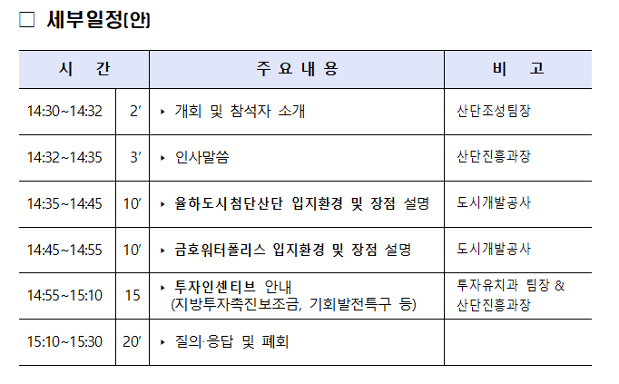 2025년말 준공을 앞 두고 있는 율하도시첨단산업단지와 금호워터폴리스의 입지환경 및 장점, 투자 인센티브를 알아볼 수 있는 율하.금호 산업단지 분양설명회를 개최합니다 1. 일 시 : '25.10.15.(수) 14:30~15:30 2. 장 소 : IM뱅크 제2본점 영업부 4층 다목적홀 (북구 옥산로 111) 3. 참 석 : 100명정도(관심있으신 기업, 산단 유치업종 분야 지원기관 등) 4. 내 용 : 율하, 금호산단 개요 및 장점, 투자인센티브 안내 5. 문 의 : 대구광역시청 산단진흥과(053-803-6022) 지역 내 공장 이전이나 확장을 고민하고 계신 기업의 많은 관심과 참여부탁드리며 율하산단과 금호워터폴리스산단의 입주업종은 붙임파일을 참고해 주시기 바랍니다.![]()