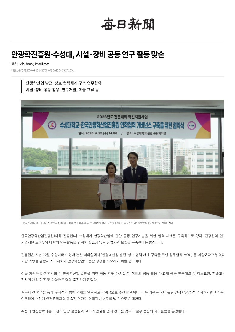 기사 바로 보기 : 안광학진흥원-수성대, 시설·장비 공동 연구 활동 맞손