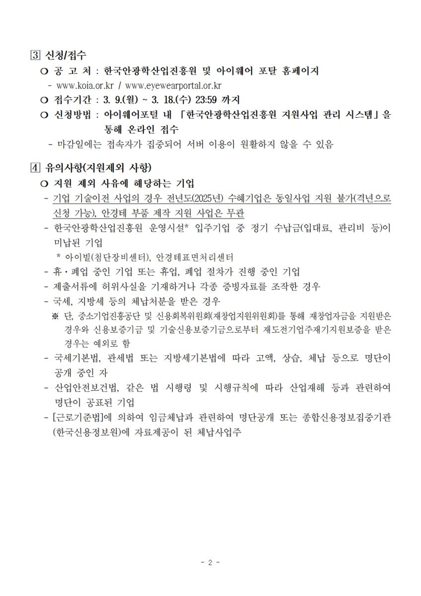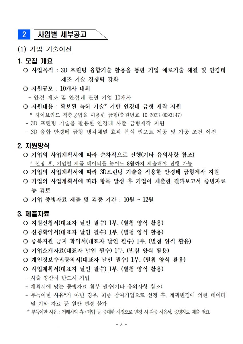[ 진행중 ] 2026년 3D융합안경테 제조기반 구축 사업 통합 재공고 첨단기술지원팀 작성일2026.03.09 공고기간2026-03-09 ~ 2026-03-18 URL 링크 조회수207 2026년 3D융합안경테 제조기반 구축사업 재공고.pdf 14393_(양식)2026년 3D융합안경테 제조기반 구축 사업 참여신청서.hwp 목록으로 이전글 [모집공고] 제24회 대구국제안경전(DIOPS 2026) 북구안경특구기업지원관 참가업체 모집안내 다음글 다음글이 없습니다.