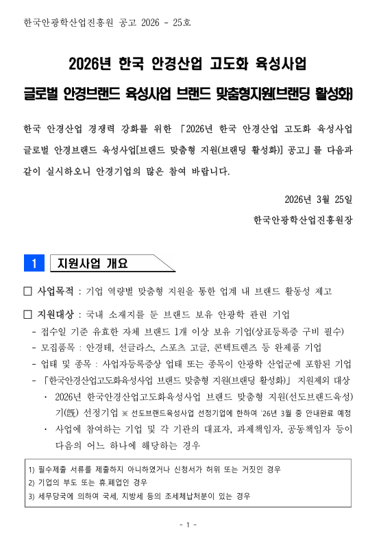 [ 종료 ] 2026년 글로벌 안경 브랜드 육성사업[브랜드 맞춤형 지원(브랜딩 활성화)] 참여기업 모집공고 관리자 작성일2026.03.25 공고기간2026-03-25 ~ 2026-04-10 URL 링크 조회수720 ※ 사업담당자 : 한국안광학산업진흥원 전략연구팀 문소영 주임 053-350-7854 / msy@koia.or.kr [공고문] 2026년 한국안경산업고도화육성사업 통합공고_글로벌안경브랜드육성(브랜딩활성화)_최종.pdf [신청양식] 2026년 글로벌안경브랜드육성사업 참여신청서(브랜딩활성화).hwp [신청양식] 2026년 글로벌안경브랜드육성사업 참여신청서(브랜딩활성화).docx 목록으로 이전글 2026년 소공인특화지원센터 「소공인 공동판매 지원사업」 참여 소공인 모집공고 다음글 2026년도『 대·중소상생형(삼성) 스마트공장 구축사업 』 모집공고