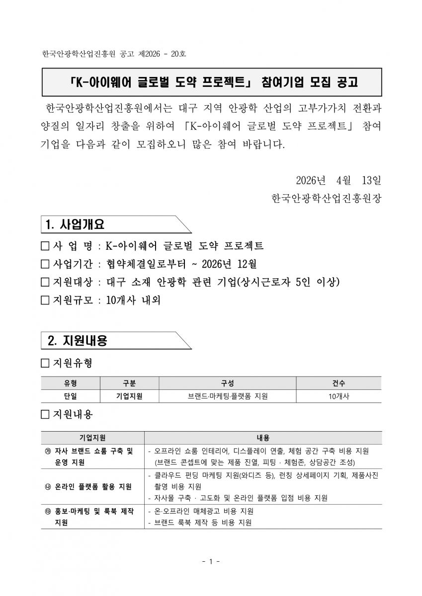 [ 진행중 ] 「K-아이웨어 글로벌 도약 프로젝트」 참여기업 모집 공고 시행 관리자 작성일2026.04.13 공고기간2026-04-13 ~ 2026-04-30 URL 링크www.eyewearportal.or.kr 조회수453 K-아이웨어 글로벌 도약 프로젝트 참여기업 모집공고.hwp 98492_아이웨어포털 접수 매뉴얼.pdf 목록으로 이전글 2026년 소공인특화지원센터 지원사업 1차 통합공고(특화 교육, 구매 조건부 제품화 지원, 토탈마케팅 지원) 다음글 2026년 소공인특화지원센터 지원사업 2차 통합공고(도제 교육, 맞춤형 제품화 지원, 제조설비 수리비 지원)