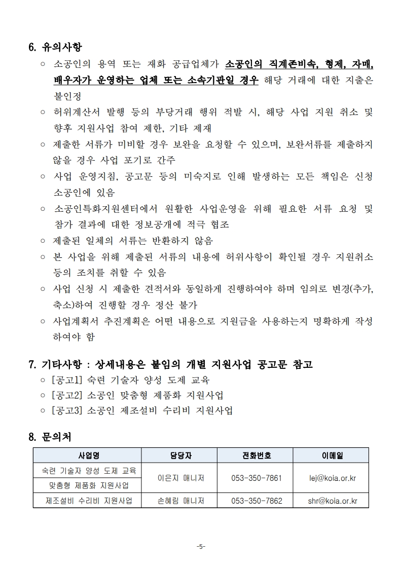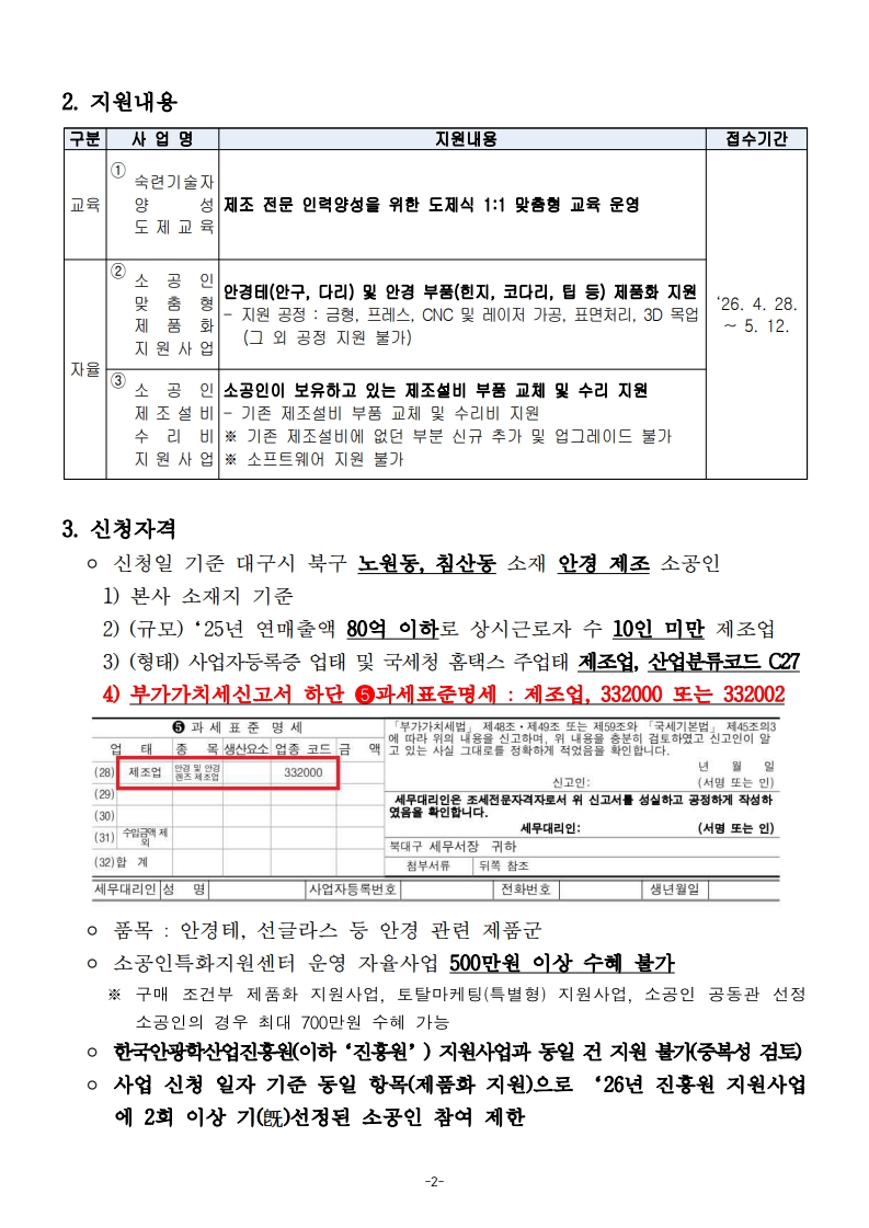 [ 진행중 ] 2026년 소공인특화지원센터 지원사업 2차 통합공고(도제 교육, 맞춤형 제품화 지원, 제조설비 수리비 지원) 소공인특화지원센터 작성일2026.04.28 공고기간2026-04-28 ~ 2026-05-12 URL 링크 조회수86 1. (공고번호 제2026-22호)2026년 소공인특화지원센터 지원사업 2차 통합공고.pdf 40578_2. 2026년 소공인특화지원센터 지원사업 세부 모집공고 및 신청서.zip 3. 2026년 소공인특화지원센터 자율사업 추진 시 유의사항(업로드용).pdf 15073_4. 소상공인24 매뉴얼(회원가입 및 사업신청).pdf 목록으로 이전글 「K-아이웨어 글로벌 도약 프로젝트」 참여기업 모집 공고 시행 다음글 다음글이 없습니다.
