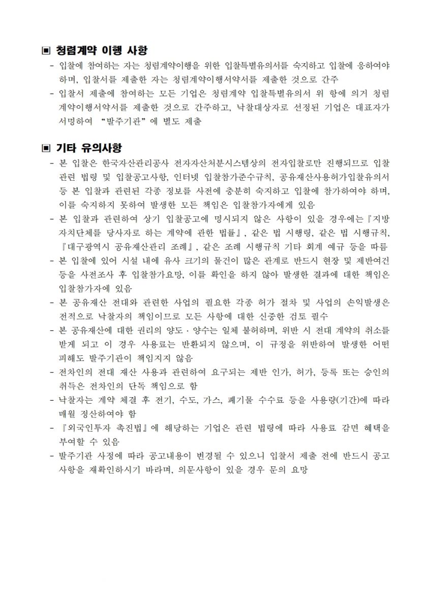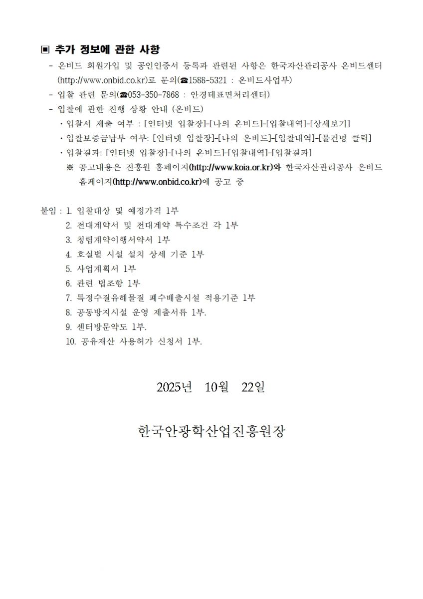 [ 종료 ] 2025년 6차 안경테표면처리센터(지식산업센터) 입주기업 모집공고 안경테표면처리센터 작성일2025.10.22 공고기간2025-10-22 ~ 2025-11-03 URL 링크https://www.onbid.co.kr/op/ppa/plnmmn/publicAnnounceRlstDetail.do?pbctNo=9984889&plnmNo=846038 조회수218 (임대공고문) 안경테표면처리센터 2025년 6차.hwp 13152_붙임서류.zip 목록으로 이전글 2025년도 아이빌(EYE VIL) 시설 임대 12차 입찰공고 다음글 2026년 한국안광학산업진흥원 주차·경비·청소 통합관리 용역 입찰공고