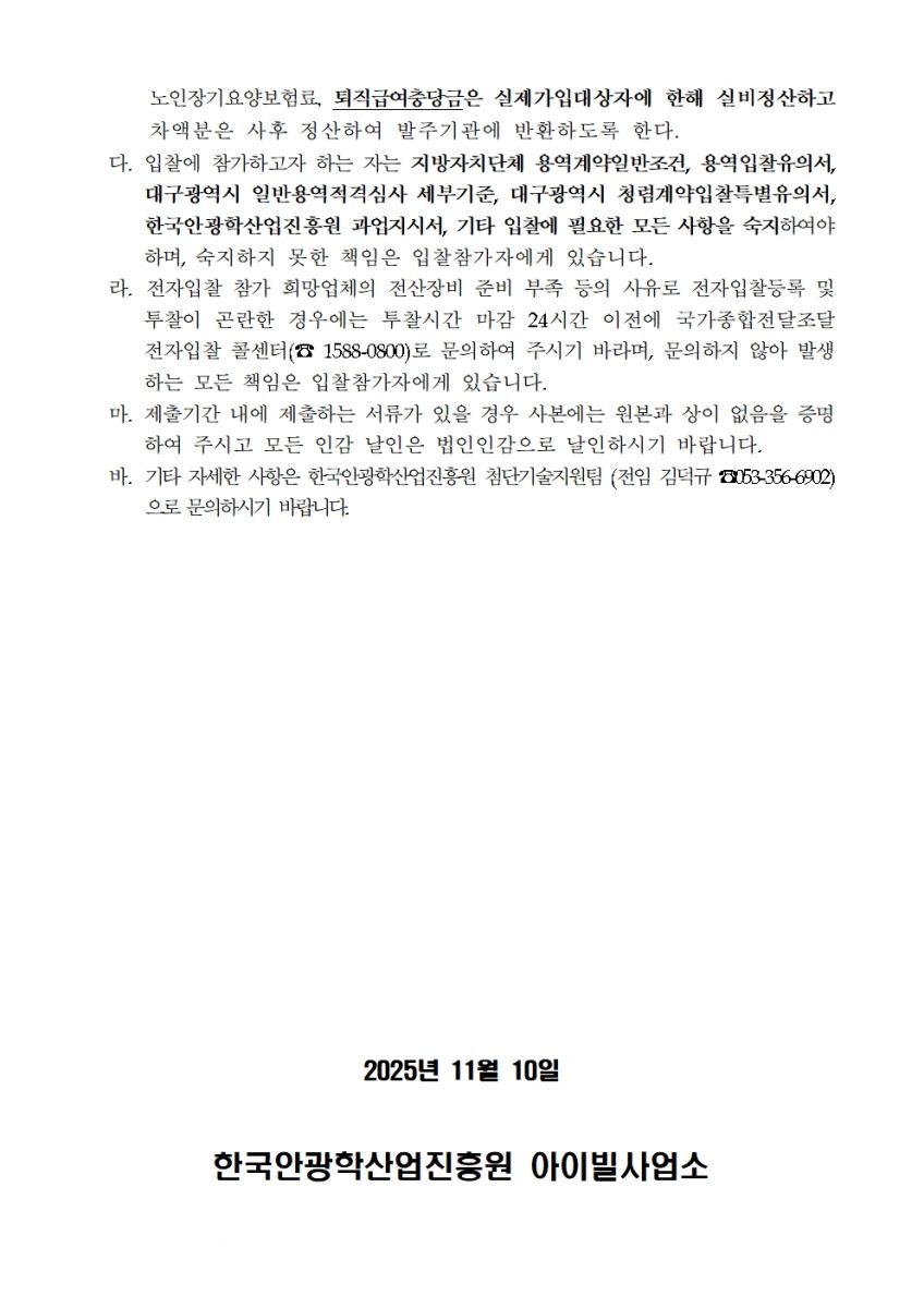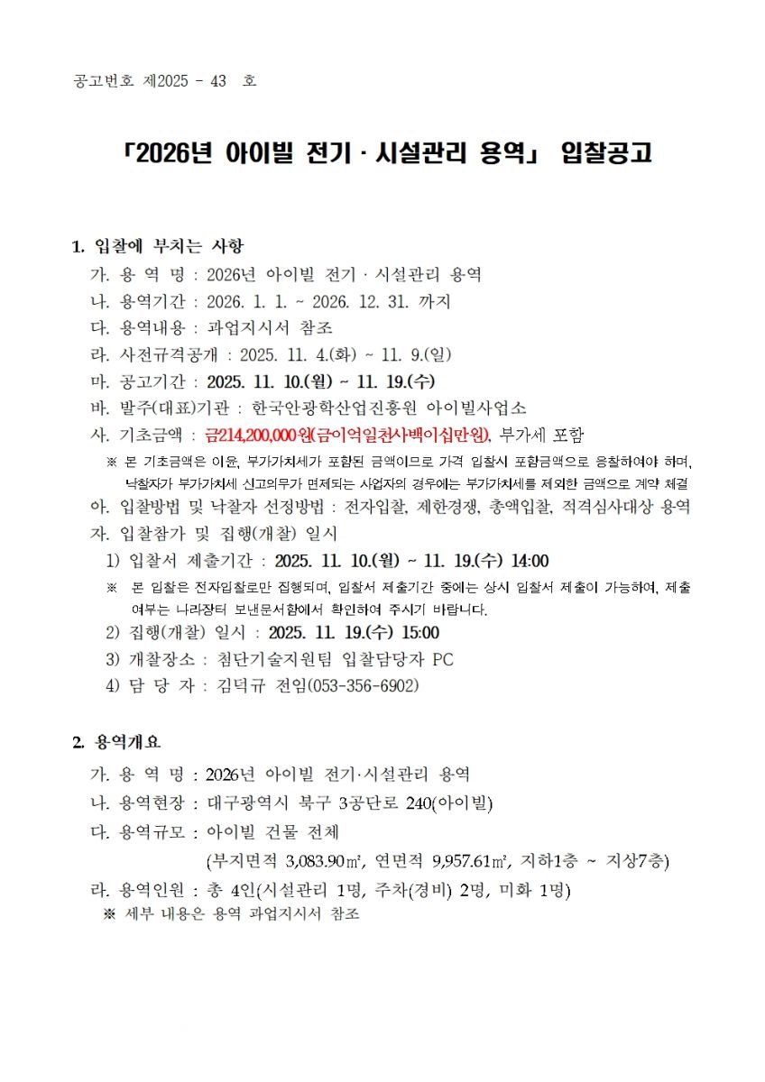 [ 종료 ] 2026년도 아이빌 전기시설관리용역 입찰공고 첨단기술지원팀 작성일2025.11.10 공고기간2025-11-10 ~ 2025-11-19 URL 링크 조회수96 1. 입찰공고_2026년도 아이빌 전기시설관리용역.pdf 2. 과업지시서_2026년도 아이빌 전기시설관리용역.pdf 목록으로 이전글 2026년 한국안광학산업진흥원 주차·경비·청소 통합관리 용역 입찰공고 다음글 2026년 안경테표면처리센터 시설관리용역 입찰공고