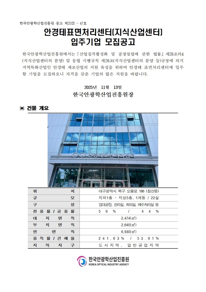 [ 종료 ] 2025년 7차 안경테표면처리센터(지식산업센터) 입주기업 모집공고 안경테표면처리센터 작성일2025.11.13 공고기간2025-11-13 ~ 2025-11-20 URL 링크 조회수95 (임대공고문) 안경테표면처리센터 2025년 7차.hwp 31697_붙임서류.zip 목록으로 이전글 「불용물품(장비) 일괄 매각」 입찰공고 다음글 2025년 8차 안경테표면처리센터(지식산업센터) 입주기업 모집공고