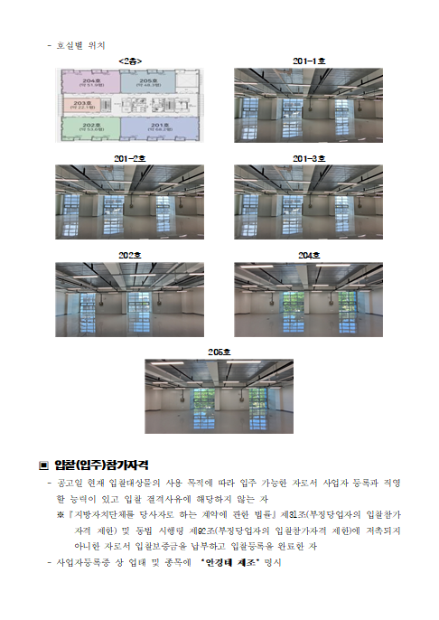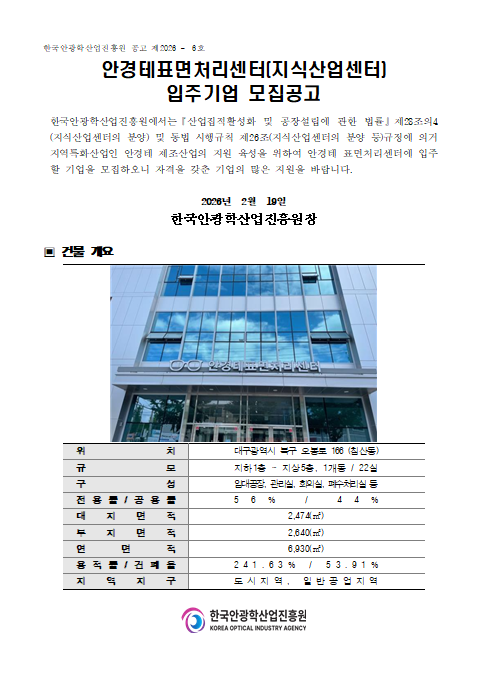 [ 종료 ] 2026년 (1차) 안경테표면처리센터(지식산업센터) 입주기업 모집공고 관리자 작성일2026.02.19 공고기간2026-02-19 ~ 2026-02-27 URL 링크 조회수70 (임대공고문) 안경테표면처리센터 2026년 1차(201-1~3,202호,204호,205호).hwp 붙임. 붙임서류.zip 목록으로 이전글 2026년도 아이빌(EYE VIL) 시설 임대 1차 입찰공고 다음글 2026년도 아이빌(EYE VIL) 시설 임대 2차 입찰공고