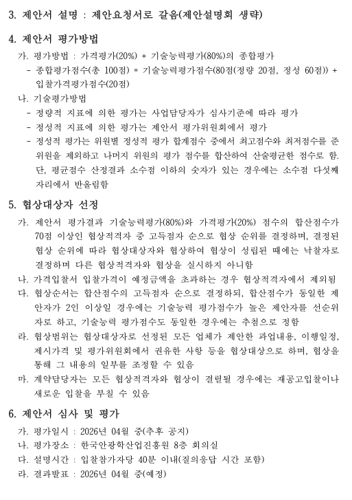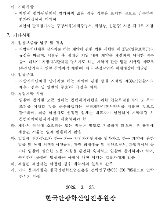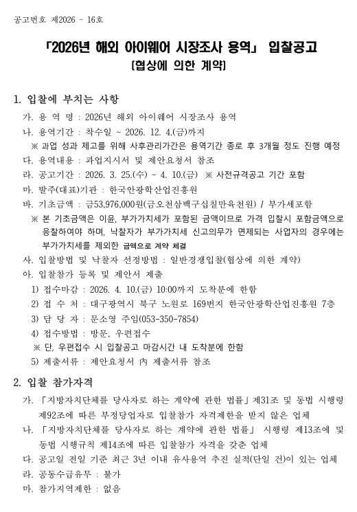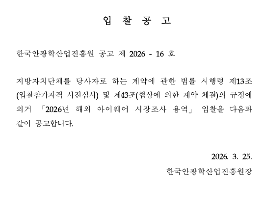 [ 종료 ] 2026년 해외 아이웨어 시장조사 용역 입찰공고 관리자 작성일2026.03.25 공고기간2026-03-25 ~ 2026-04-10 URL 링크 조회수148 1. 입찰공고문_26년 해외 아이웨어 시장조사 용역.pdf 2. 과업지시서_26년 해외 아이웨어 시장조사 용역.pdf 3. 제안요청서_26년 해외 아이웨어 시장조사 용역.pdf 3-1. 제안요청서_26년 해외 아이웨어 시장조사 용역(관련서식)_한글.hwp 목록으로 이전글 2026년 금형조립수행 용역 입찰공고 다음글 안경테표면처리센터 시설임대공고(3차)
