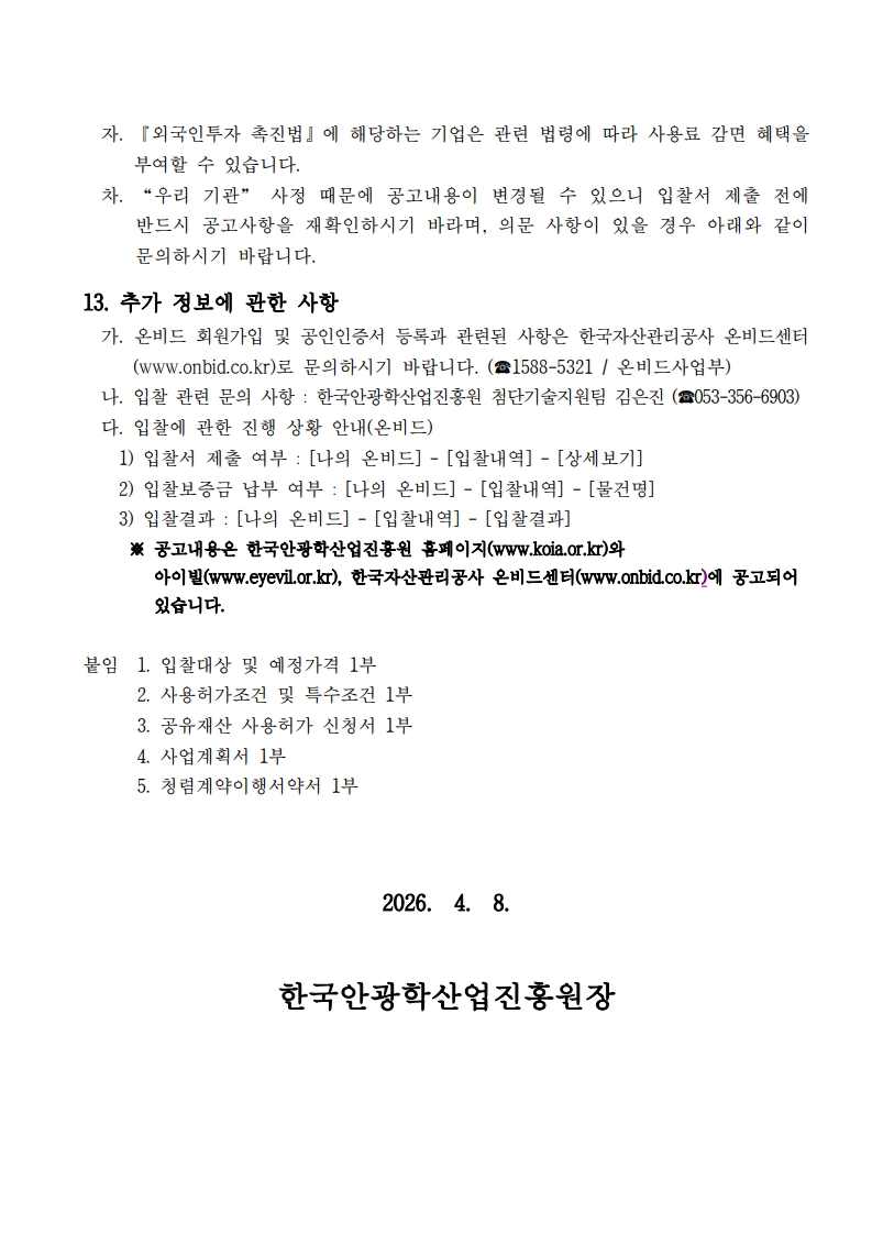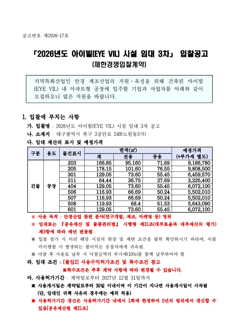 [ 종료 ] 2026년도 아이빌(EYE VIL) 시설 임대 3차 입찰공고 첨단기술지원팀 작성일2026.04.08 공고기간2026-04-08 ~ 2026-04-17 URL 링크 조회수82 붙임 1. 2026년도 아이빌 시설 임대 3차 공고문.pdf 25892_붙임 2. 공고 관련 별첨서류.zip 목록으로 이전글 안경테표면처리센터 시설임대공고(3차) 다음글 다음글이 없습니다.