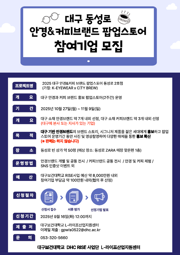 [대구보건대학교] 대구 안경 커피브랜드 동성로 팝업스토어 참여기업 모집 공고(~ `25. 9. 16.(화), 12:00까지)