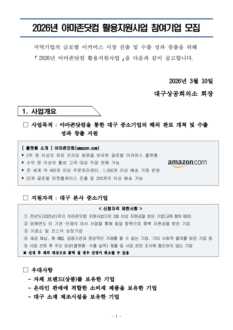 [대구상공회의소] 2026년 아마존닷컴 활용지원사업 참여기업 모집 공고(2026.03.10.~2026.03.31.)
