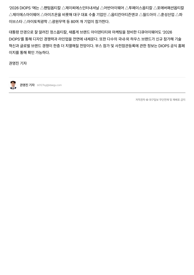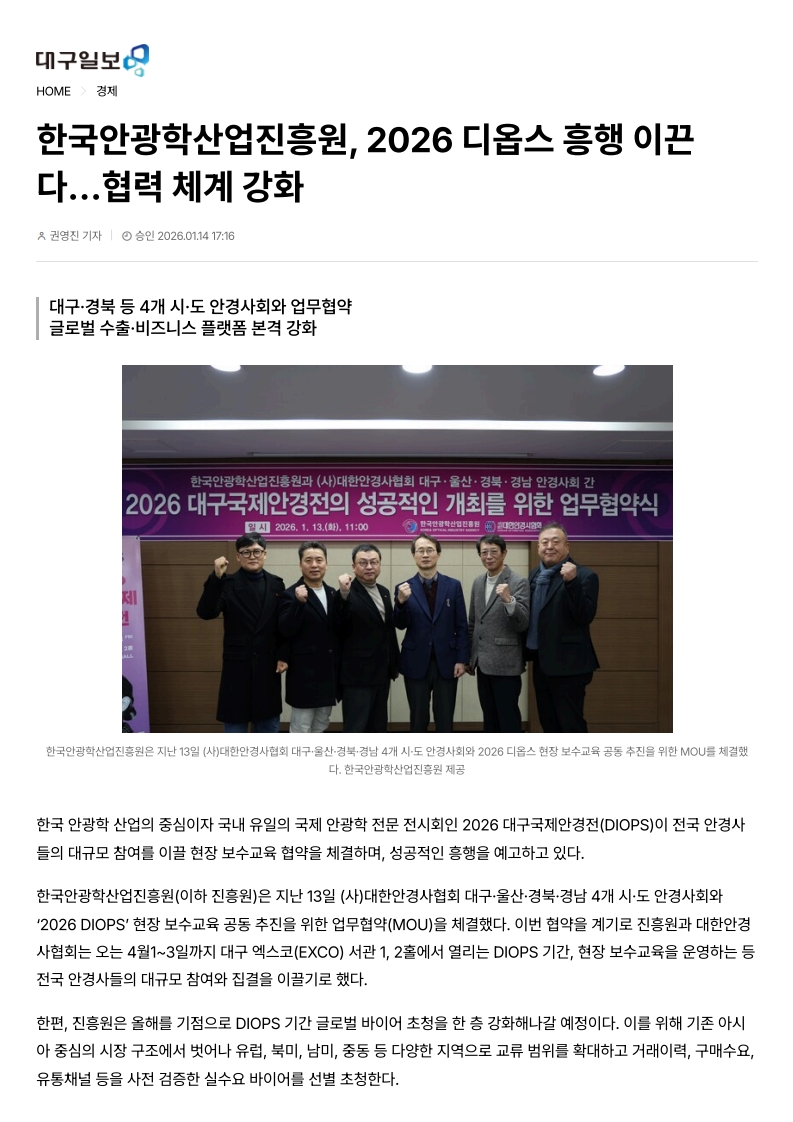 [대구일보] 한국안광학산업진흥원, 2026 디옵스 흥행 이끈다…협력 체계 강화