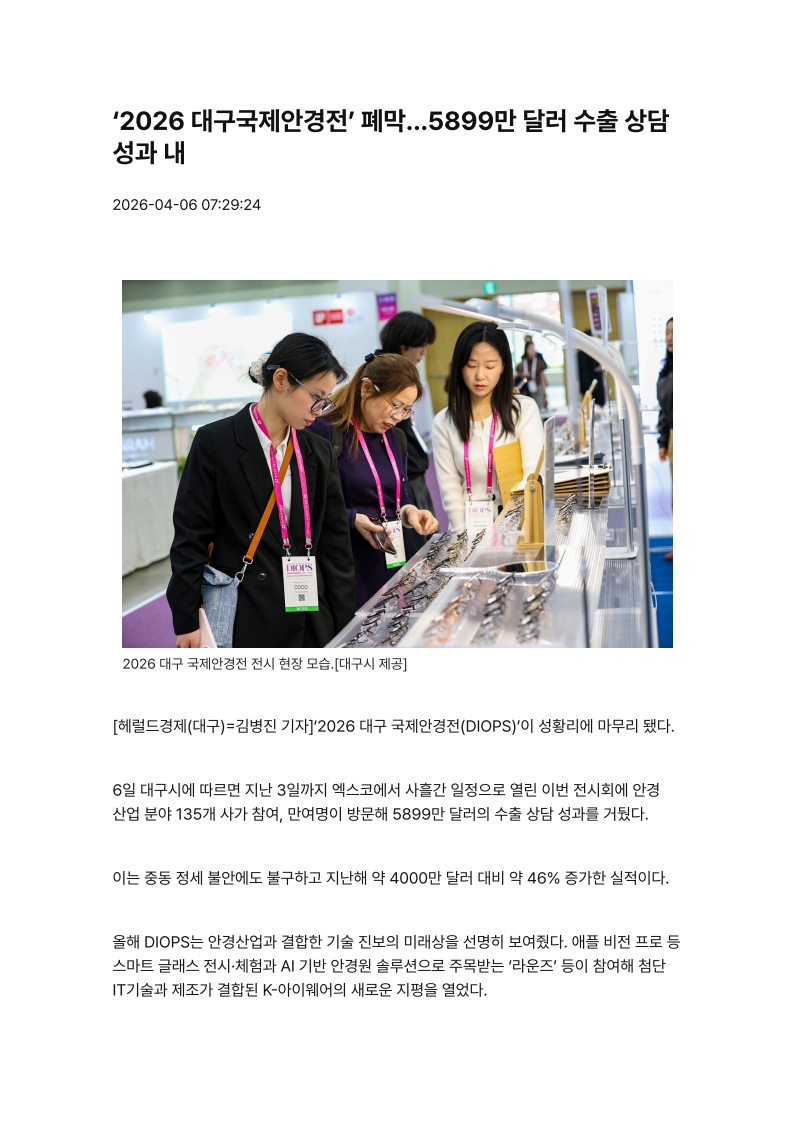 기사 바로 보기 : ‘2026 대구국제안경전’ 폐막…5899만 달러 수출 상담 성과 내
